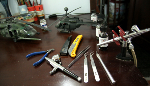 "Đồ nghề của người làm mô hình nói ra thì muôn thuở, vớ vẩn nhất như từ giấy cũng trở thành đồ nghề, chuyên nghiệp thì kể đến các loại chổi, kéo, kìm, kẹp... cho đến máy phun sơn loại nhỏ. Nói chung tùy vào cấp độ của từng người chơi vì đã chơi chuyên nghiệp càng chơi mới càng thấy thiếu !" - Anh Minh người chơi mô hình chia sẻ.
